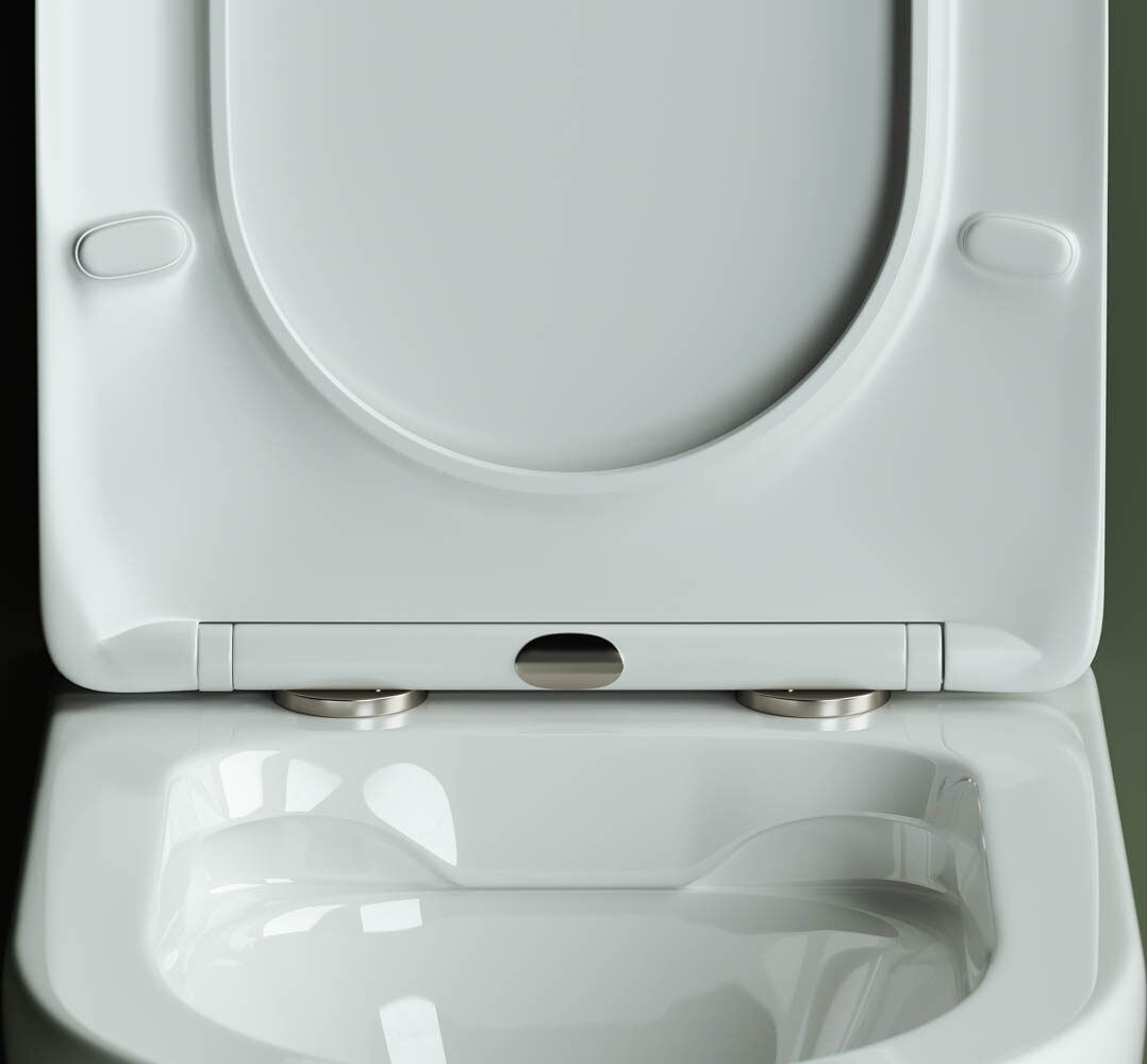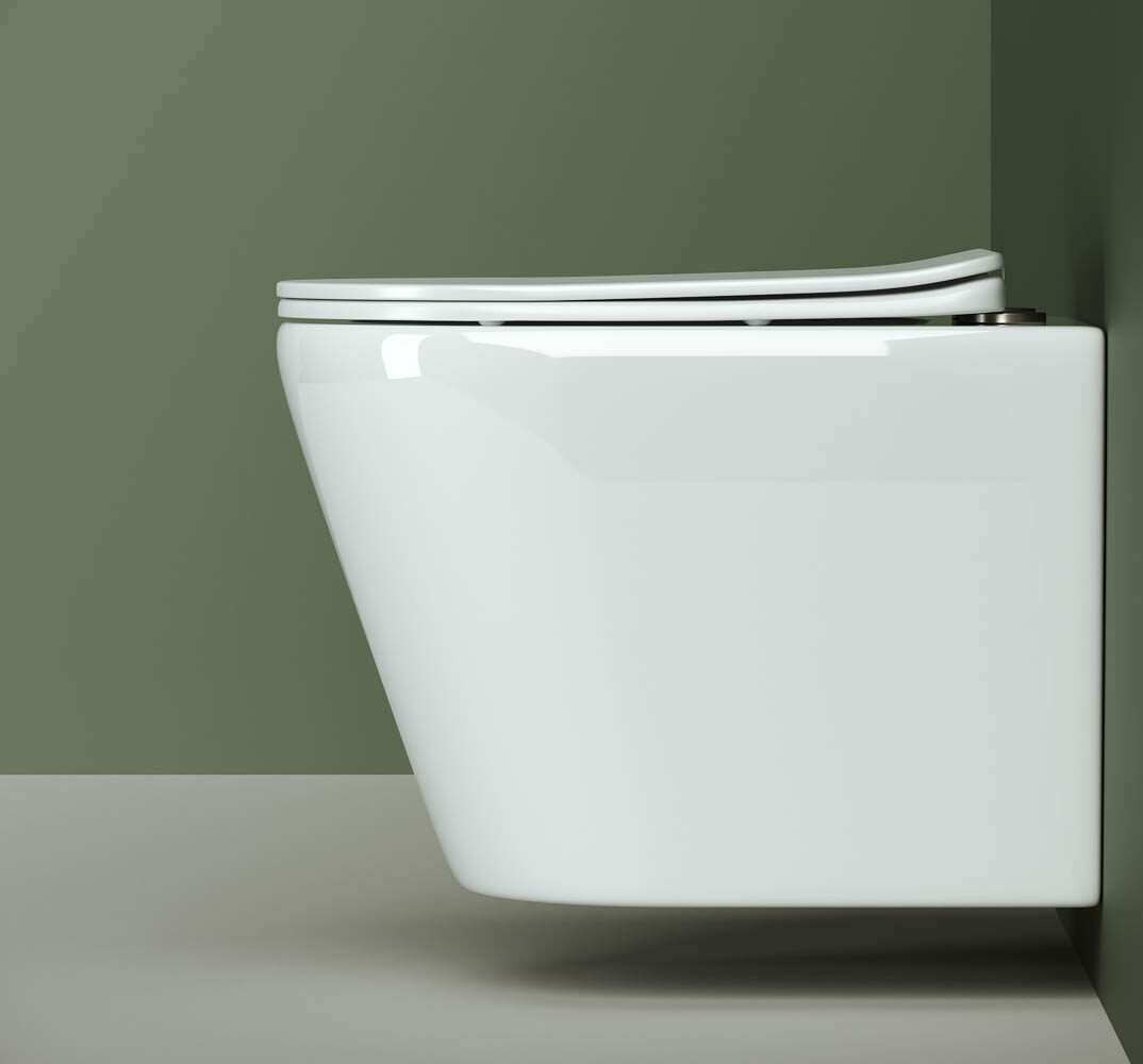 Подвесной унитаз HighLight Rimless, глубокий смыв, с крепежом для полностью скрытого монтажа, ультра тонким с сидением и крышкой с функцией плавного закрытия.