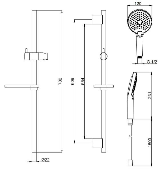 Душевой гарнитур AQM8101BN H=745 мм, Ø120 мм, 3 режима, мыльница, шланг 1500 мм, никель шлифованный